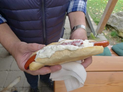 Jetzt stärken wir uns am Höhlenhaus mit Zwiebelkuchen und Feuerwurst mit Kraut und Tsatsiki,