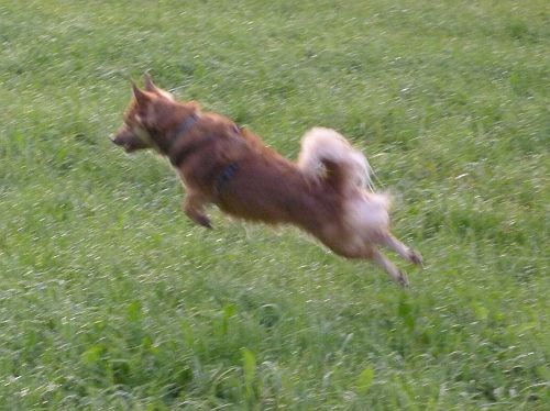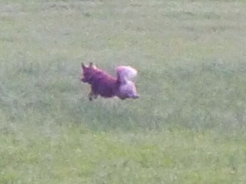 Carl darf wieder frei rennen, läuft auch manchmal recht weit in die Wiesen rein und springt, was das Zeug hält. Er schaut aber immer, wo wir sind und holt uns wieder ein.