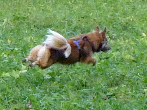 Hier ist viel Platz, hier kann Carl springen. Und er ist so gut gelaunt, dass er Hoppelhasi macht, also im Mäuselsprung die ganze Wiese abhüpft.