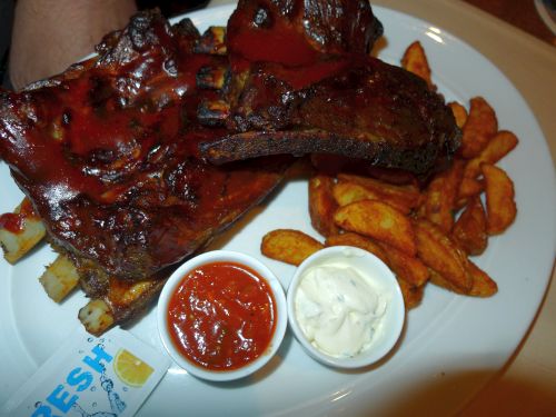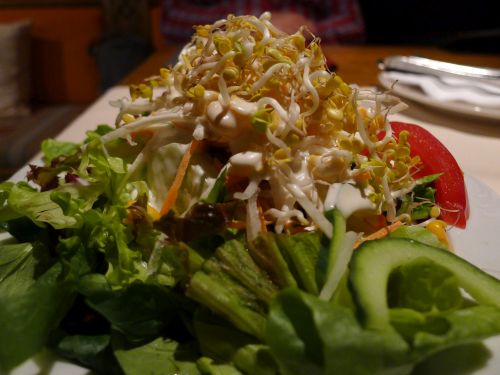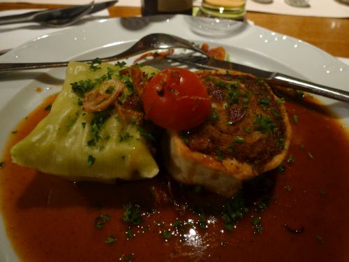 Also gut, gehen wir in die Hirschsprungstuben direkt neben dem Stellplatz. Peter bestellt sich Sparerips, also Schälrippchen, und ich das Allgäu-Trio als Duo, denn Kässpätzle auf die Nacht sind mir doch zu gefährlich im Bauch. Ich dachte, ich krieg dann wenigstens bissi mehr Krautkrapfen oder Maultasche, aber nein, ich kriegs stattdessen billiger. Nützt mir aber nix, denn eigentlich wollte ich mich satt essen.