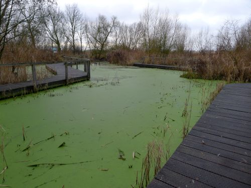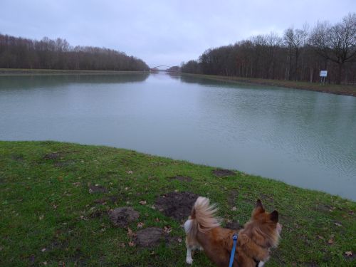 Am Parkplatz befindet sich erst mal ein Lehrpfad, den ich aber alleine machen muss, denn gegen die Rutschgefahr sind die Bohlen mit Hasendraht bespannt, und das ist garnix für Carlchens Krallen. Gegenüber sieht man ein Wehr, das aber nicht näher erklärt ist.