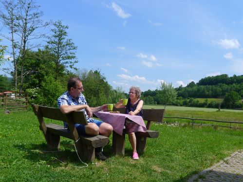Leider haben wir die Abzweigung verpasst und landen im Industriegebiet vor Altengronau. Während Peter im Wendehammer anhält parkt hinter uns ein PKW. Wir dachten schon, es gibt Ärger, weil wir hier nicht stehen dürfen, aber dann erkennen wir Marianne und Reiner, die schon seit Mernes hinter uns her fahren, denn sie wollten uns besuchen.