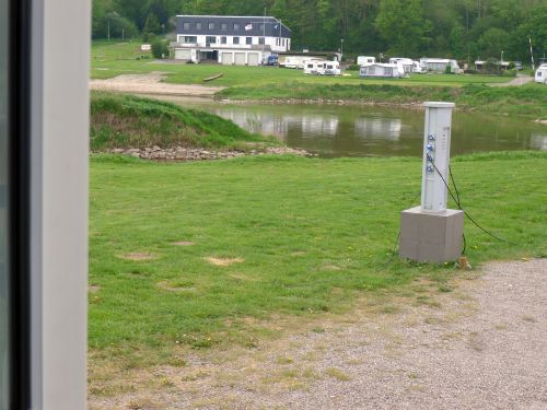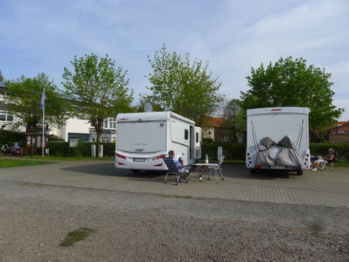 Der Stellplatz liegt mitten im Dorf am Rand eines Festplatzes mit Bolzplatz und Skaterbahn. Er ist sogar kostenlos, lediglich für Strom wird um eine Spende von 2 € gebeten. Passt.