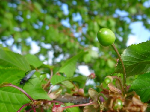 Die Apfelbäume blühen noch, während die Kirschen schon angesetzt haben. Und da hat sich doch tatsächlich eine kleine Märzmücke aufs Bild gemogelt. Komisch, dass sie Märzmücke heißt, wo sie doch eigentlich eine Markusfliege ist, weil sie meist am Markustag schwärmt und die Merkmale einer Fliege aufweist. Und der Markustag ist am 25. April, also vorgestern. Heute stehen sie also zu hunderten in der Luft und vollführen unberechenbare schwerfällige Bewegungen. Eklige schwarze Haarmücken, die es schamlos im Flug treiben.