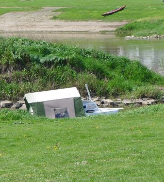 und dann eine gute Stunde Mittagsschlaf, während draußen ein ordentlicher Landregen runtergeht. Den Rest des Tages machen wir einfach mal garnix, gucken den Schwänen und Enten zu, jedenfalls ich, Peter kreuzworträtselt, und dann kommt plötzlich ein Zelt vorbeigeschwommen.