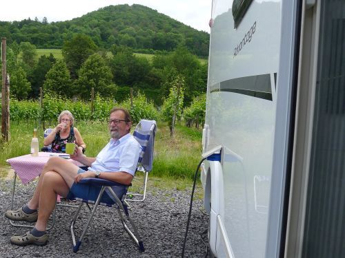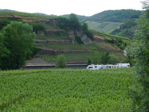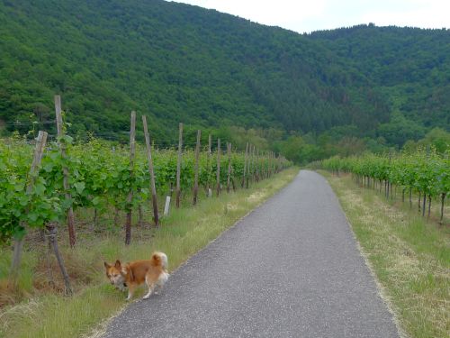 Morgengassi bei herrlichem Sonnenschein. Und nach dem Frühstück packen wir zusammen und fahren erst mal nach Bad Neuenahr einkaufen. Danach nach Bad Bodendorf, der Stellplatz hört sich ganz nett an. Nee, nach der herrlichen Landschaft bei Mayschoss geht sowas garnicht. Wir fahren also dorthin zurück und gehen demnächst mit Carl an der Leine durch die Wingerte, damit er kein verseuchtes Gras frisst.