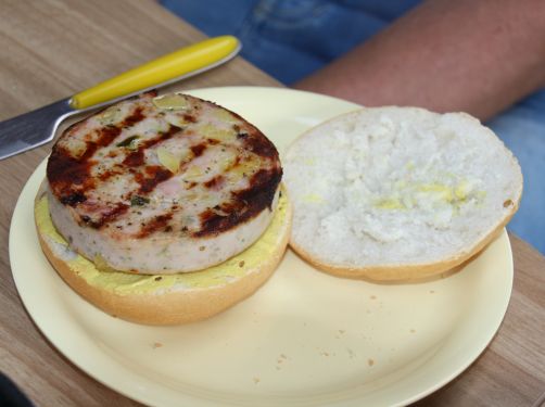 Abendessens das Womo abgefackelt. Die Riesenfrikadelle für Peter wars..... und