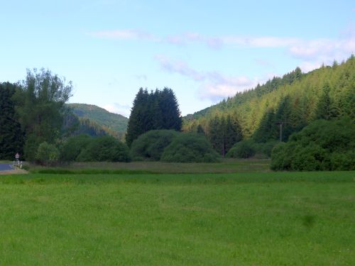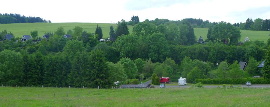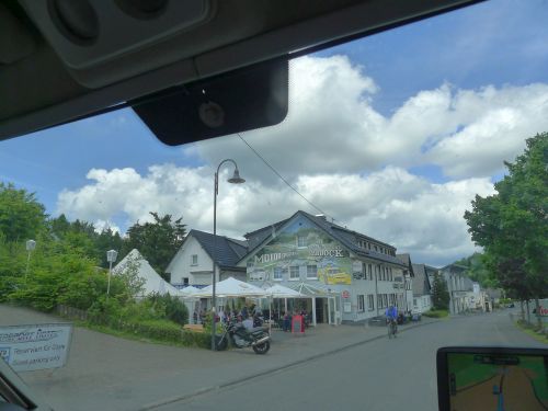 Aber weit gefehlt. Irgendwas findet hier scheinbar immer statt, und der Platz ist gesperrt. Außerdem stehen die Fahrzeuge an jedem Straßenrand. Anhalten oder wenden oder sonstwas geht garnicht, und auf dem Weg nach Adenau, dem nächsten Punkt auf meiner Landkarte, kommen uns die Raser wie irre entgegen. Und ein holländisches Womo, dem Peter noch nett zuwinkt, fährt uns doch in einer Kurve mit einem Wahnsinnsknall den Spiegel ab. Das gibt uns den Rest und wir verlassen uns jetzt wieder auf Herrn TomTom, der uns ab hier in einem großen Bogen nach Dockweiler führt. Puh, geschafft.