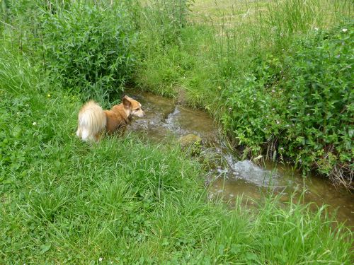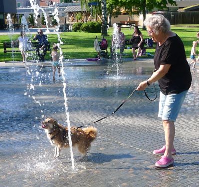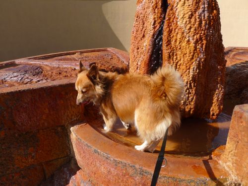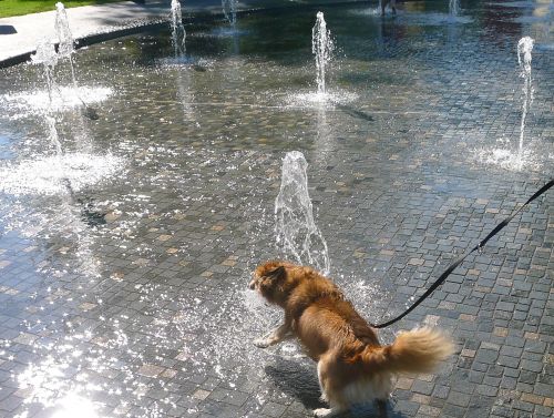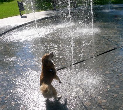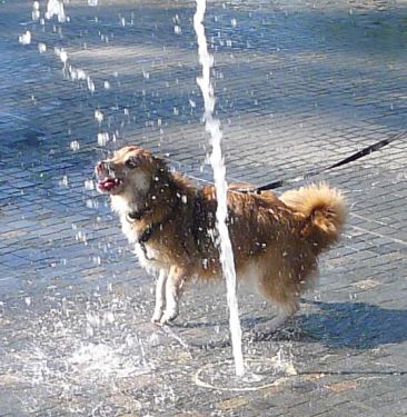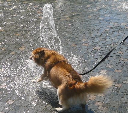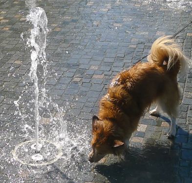 Zum krönenden Abschluss springt er in den Solebrunnen, was er eigentlich nicht darf. Ich hätte auch nicht gedacht, dass er die glitschige Wand da hoch kommt. Aber er war so gut drauf, dass er meinte, auch dieses Wasser wäre lecker.