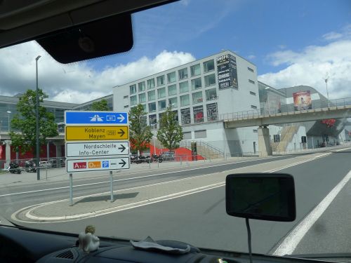 Und als er uns wieder mal in einem winzigen Dorf rechts den Berg hoch in eine schmale Gasse schicken will, streiken wir. Wir wissen natürlich keine alternative Route, denn die kleinen Dörfer gibts auf unsrer Landkarte nicht, und außerdem liegt Dockweiler am Seitenumbruch unsres Falk-Faltatlasses. Internet gibts leider auch nicht, und auch das Handy kann uns nicht navigieren. So landen wir am Nürburgring. Denn dorthin gibts Schilder.