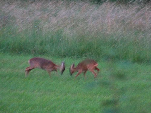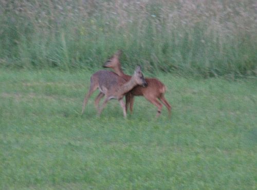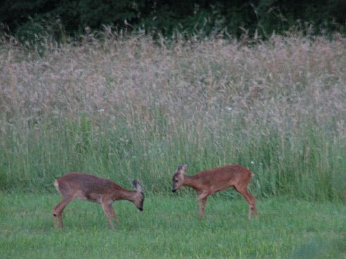 und danach das Spiel der munteren jungen Rehlein, die zuerst in Riesensprüngen über die Wiese toben. Anschließend üben sie spielerisch schon kleine Kämpfchen, und es ist ein Traum, ihnen dabei zuzuschauen.