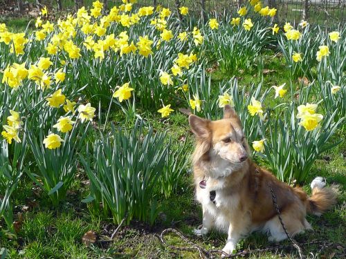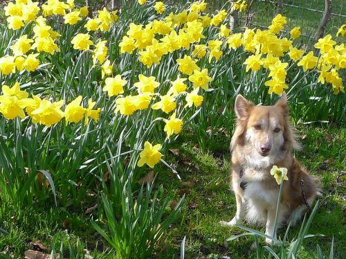 Eigentlich wollte ich ein lusdisches Bild von unserm Rüpel machen, aber irgendwie guckt er komisch, weil er nicht versteht, warum er sich in die Blumen setzen soll. Dabei haben die ja was mit ihm gemeinsam. Es sind riesig groß geratene Osterglocken, und er ein riesig groß geratener Chihuahua.