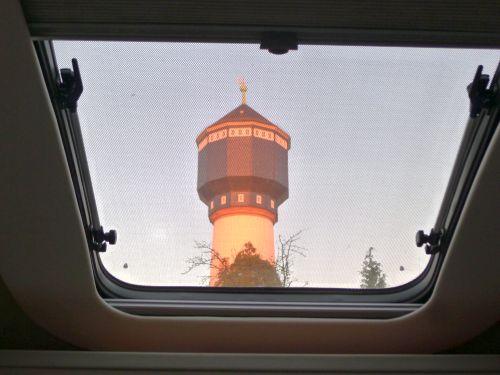 Durch das Sunroof (moderner Ausdruck fürs Dachfenster) schaut uns der in der Abendsonne stehende Wasserturm dabei zu.