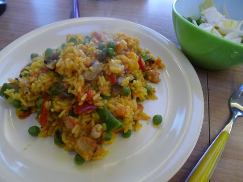 Abends gibts Geschnetzeltes, gebackene Semmelnknödeln, und Paella,