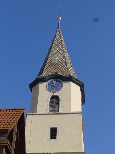 Es haut uns ebenfalls nicht vom Hocker. Aber der Kirchturm ist ausgesprochen hübsch. So bunt und glänzend sind alle hier in der Gegend. Tja, und wieder ist der Punkt oben rechts, sonst ist er unten rechts. Wird Zeit, dass ich ne neue Knipse kriege.