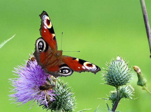 Peter hat Matratzenhorchdienst, Carl erholt sich, und ich beobachte auf der Distel vor mir ein Tagpfauenauge, das einen Admiral verdrängt und die Distel besetzt hat.
