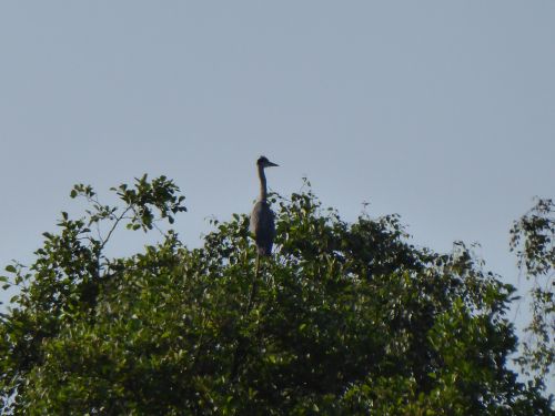 Sonntagmorgen. Zum Abschied kreist nochmal der Reiher - nicht der Geier - und setzt sich vorn in der Mitte ganz oben in den Baum. Wenn mans nicht weiß ist er nicht zu sehen. Aber meine Lumix findet alles.