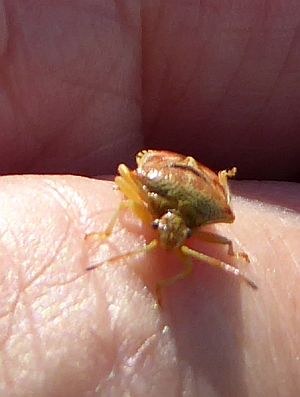 Und gleich drauf kommt eine winzige Miniwanze angeflogen. Sie ist noch richtig durchsichtig. Sie darf leben, sie kommt nicht in die Tonne.