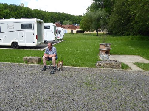 Wir machens uns vor dem Womo gemütlich, kreuzworträtsel und häkeln, und Carl geht sich zwischendurch immer mal etwas abkühlen hinterm Womo, denn es ist heute richtig schwül und heiß.