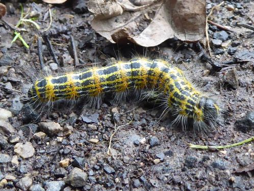 Und diese wunderprächtige große Raupe wird einmal ein total unscheinbarer Nachtfalter, der eigentlich zusammengefaltet wie ein kleines Holzstückchen aussieht. Es ist ein Mondvogel. Kann man sich gut merken, denn er hat ein umgedrehtes Vogel-V auf der Stirn.