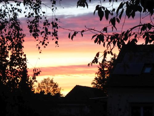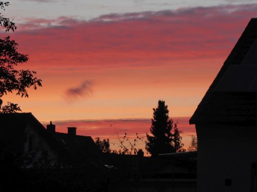 Es windet und die Nüsse fallen. Und hinterm Ort geht die Sonne auf. Erst ganz zaghaft, und dann spektakulär mit Macht. Fast kitschig flammend rot. Der Himmel brennt.