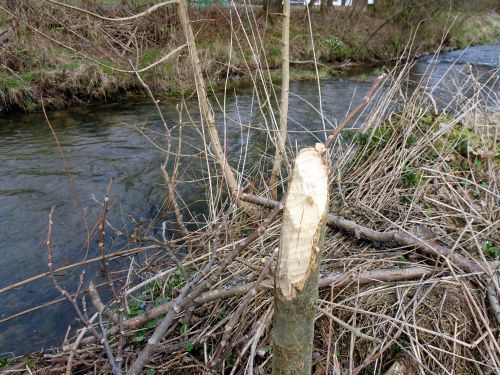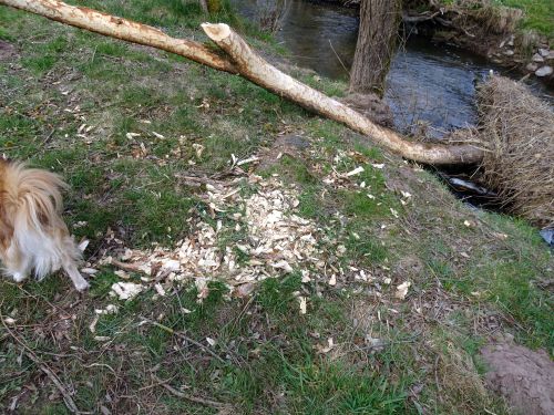 und begutachten die Fortschritte des Bibers, der so langsam alles abnagt, was er finden kann. Er kommt sogar aus dem Bach raus und hat nen richtigen Weg bis zum Stellplatz getrampelt. Da schmeckts Gebüsch scheinbar noch besser als drüben die Bäume.