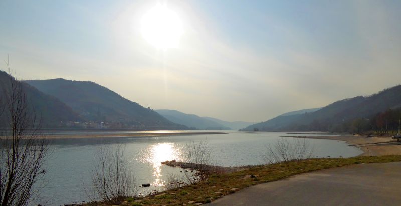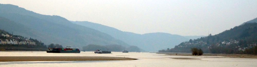 Blick nach Lorchhausen rüber. Hier sieht man an der Sandbank mitten im Rhein wie niedrig der Wasserstand ist. Sogar Felsen schauen raus.