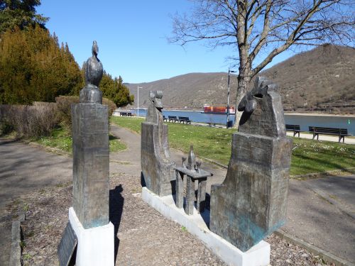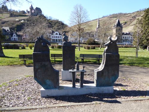 Das Bronze-Denkmal zeigt die 3 Poeten Heinrich Heine, Victor Hugo und Clemens Brentano, die es sich im romantischen Mittelrheintal gut gehen lassen.