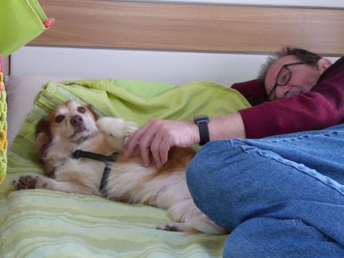 Bauch voll. Carl mit Trockenfutter, und ich mit Müsli und Banane.