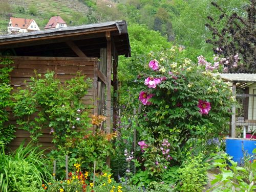gucken uns mal diesen großen Schubverband an, wie er zusammengebunden ist, und bei den Schrebergärten sehe ich diesen Riesenhibiskus