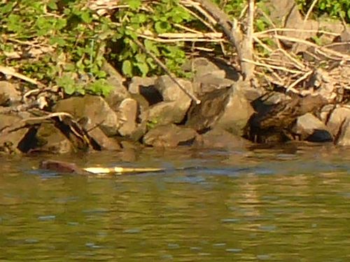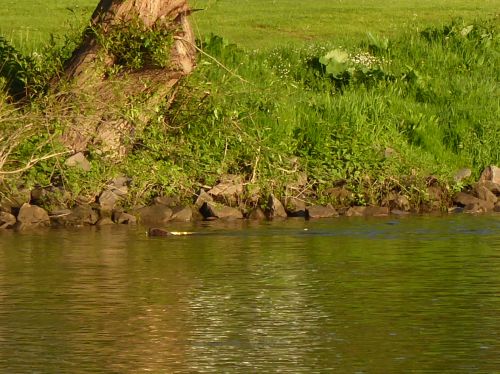 Morgengassi geht hinter zu den Gärten, dort gibts nix Neues zu sehen. Aber im Wasser ist heute was los. Mitten im Main schwimmt der Biber und schleift einen mindestens 2 m langen Ast hinter sich her. Dabei taucht er leider jedesmal gerade ab, wenn ich auf den Auslöser drücke. Deshalb gibts nur unscharfe Bilder vom anderen Ufer, dort schleppt er den bereits angeknabberten Stock nun hin.