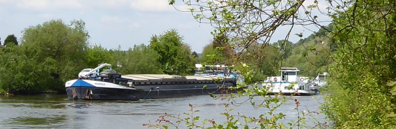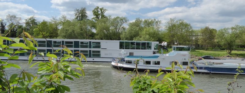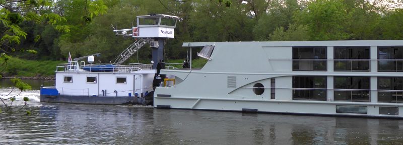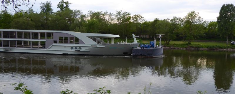 Und da kommt ein Neubau vorbei. Es will erst noch ein Hotelschiff werden, ist noch leer und führerlos, und wird deshalb geschoben.