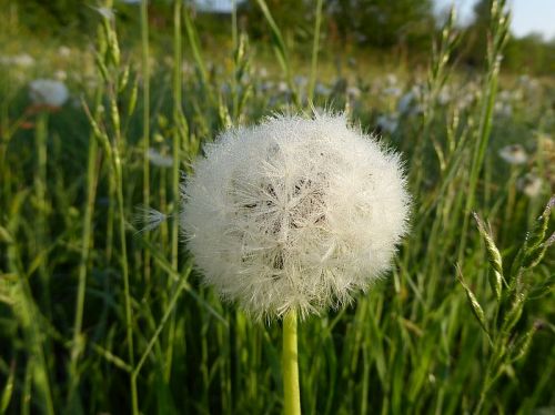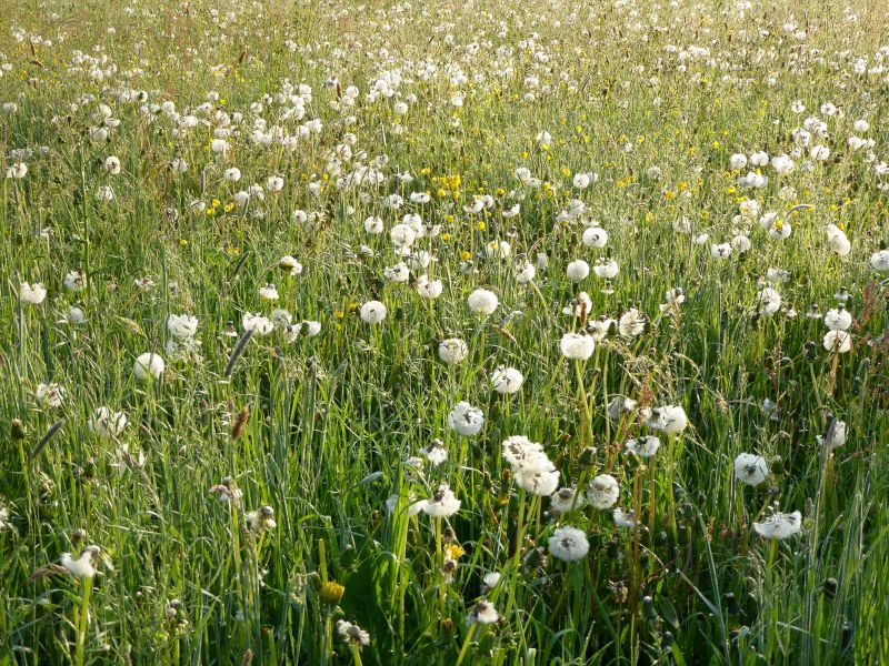 Die Löwenzähne, die letzte Woche noch dicht an dicht blühend das ganze Tal gelb erscheinen ließen, haben Form und Farbe gewechselt.