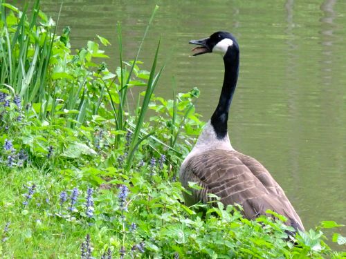 Die Kanadagans empfängt uns fauchend, aber von den Entchen ist weit und breit nichts zu sehen. Das Nest auf der Insel sieht leer aus.