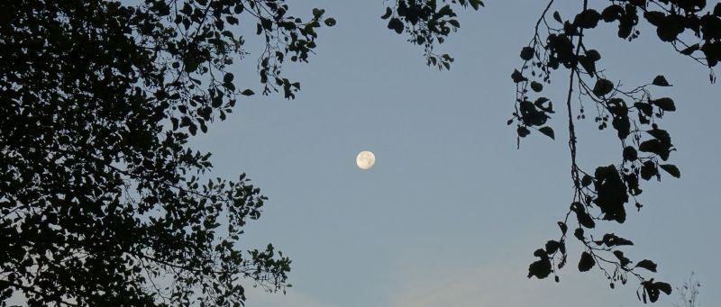 Ich hab die erste Nacht mit Aua an Hüfte und Schulter im Womo überstanden und freue mich über den Mond, der uns beim Morgengassi entlang des Kurparks begleitet.