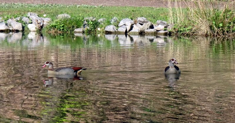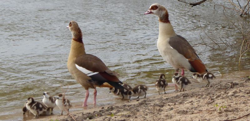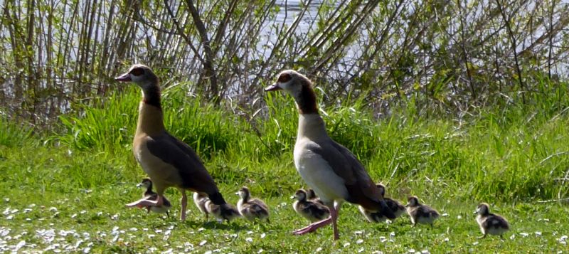 und ihr Mann hält Wache, damit die zwei Nilgänse nicht zu nahe kommen.