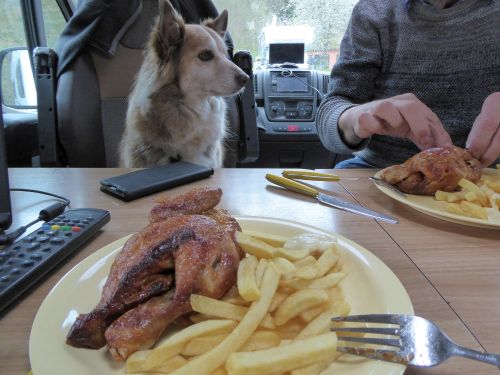 Und dann beschließen wir nach Horbach zu fahren. In Alzenau steht zufällig der Hähnchenwagen an der Straße, und so passt mir das.
