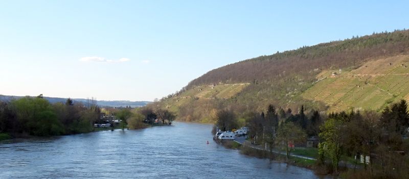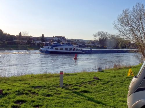 Während unserm Frühstück treibt sich in der Fahrrinne das Peilboot rum. Vielleicht kommt die Schifffahrt bald wieder in Gang. Und wir kommen dann auch in die Gänge, gucken uns auf der Fahrt zum Lidl noch den Stellplatz in Erlenbach an, treffen dort zufällig Eva, und landen dann in Kleinwallstadt