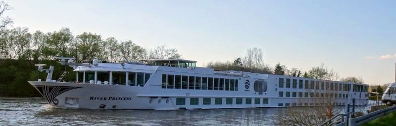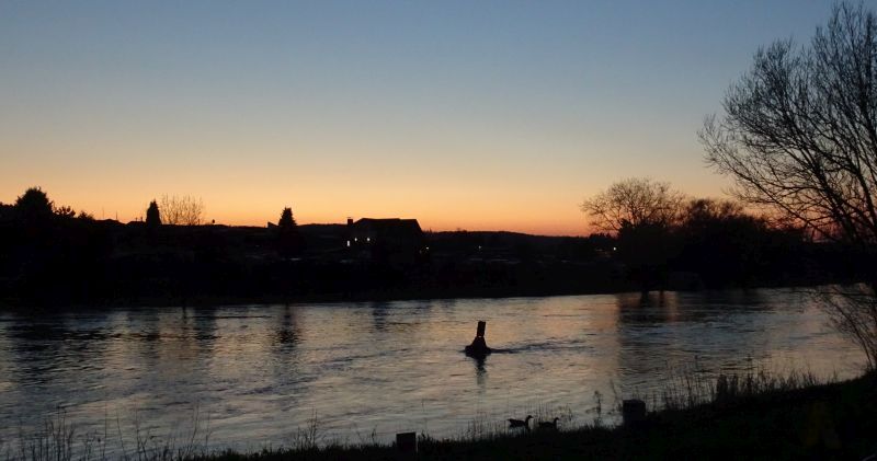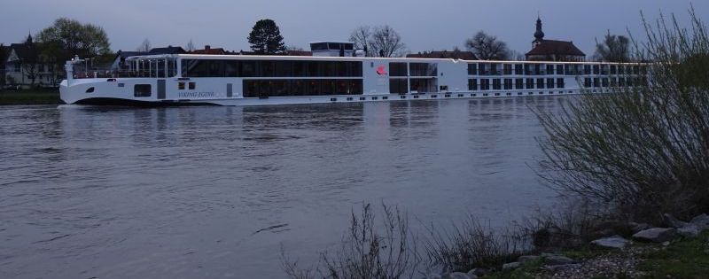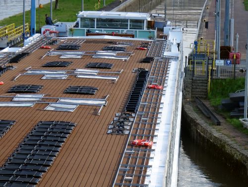 Kurz vor der Dunkelheit kommt auch hier wieder ein Hotelschiff vorbei. Aber die hiesige Schleuse ist scheinbar breiter, denn es fährt ruckzuck rein,