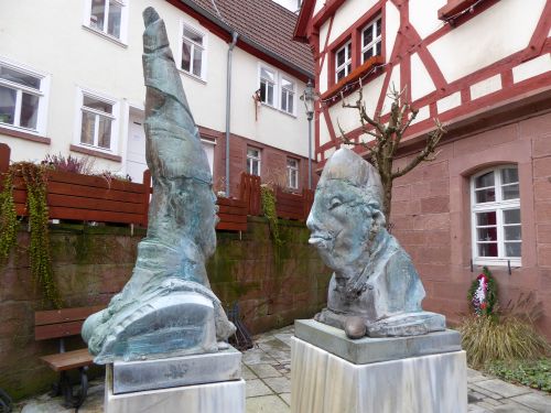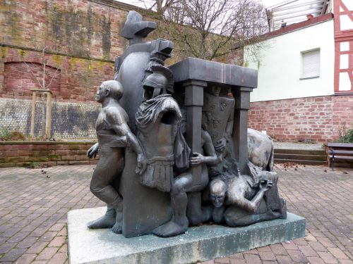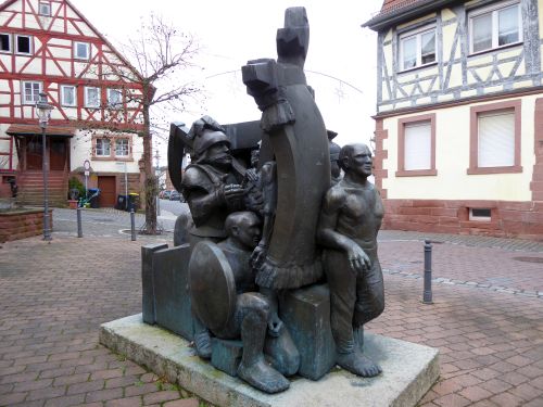 Unterhalb der Basilika steht eine gruselig anmutende Statue, die eine Zusammenfassung der Geschichte Walldürns darstellt. Geschichtliche Ereignisse in Kombination mit Wallfahrtssymbolen sind zu einem Prozessionszug zusammengefügt.