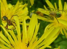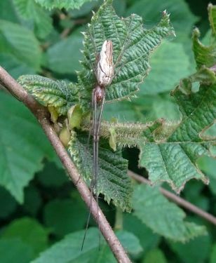 Dies hier will erst noch eins werden. Und daneben sitzt eine ganz seltsame Spinne, mit elend langen Beinen.