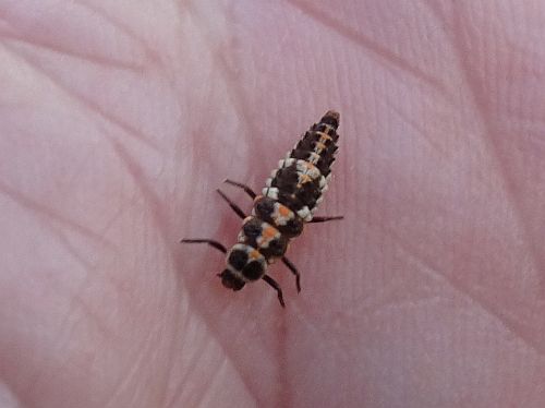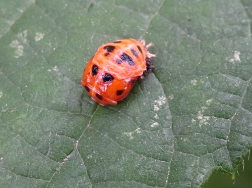 Und hier haben wir 2 Stadien des Marienkäfers. Man sieht rechts ganz schön, wie er sich sein letztes Kittelchen auszieht, um als fertiger Marienkäfer die Welt zu erkunden.