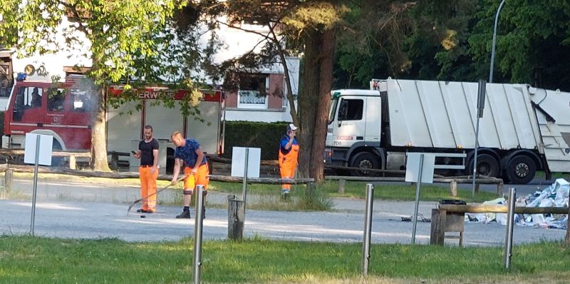 Müllauto vor uns auf dem Stellplatz, und die Arbeiter versuchen die Sperrpfosten