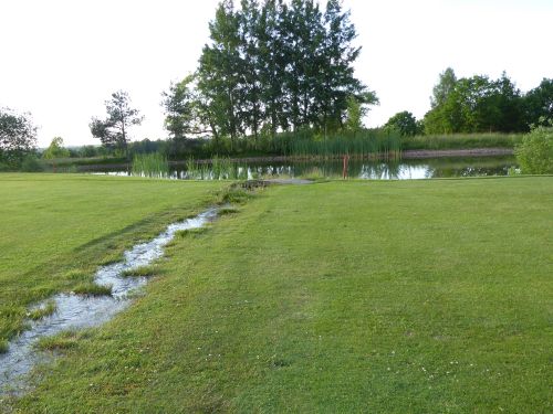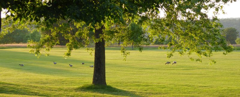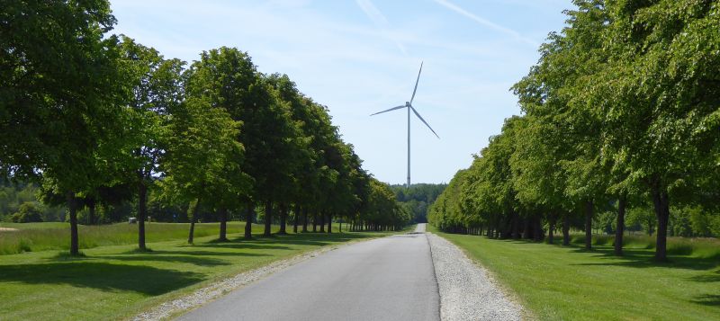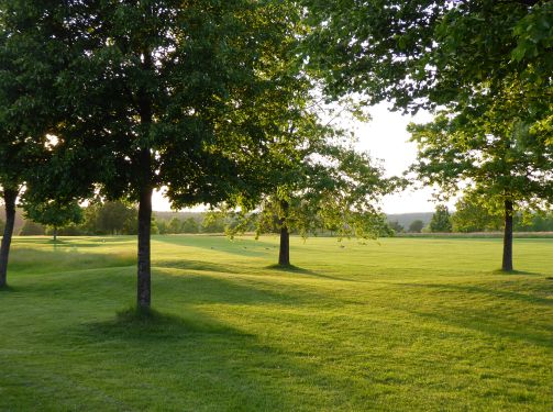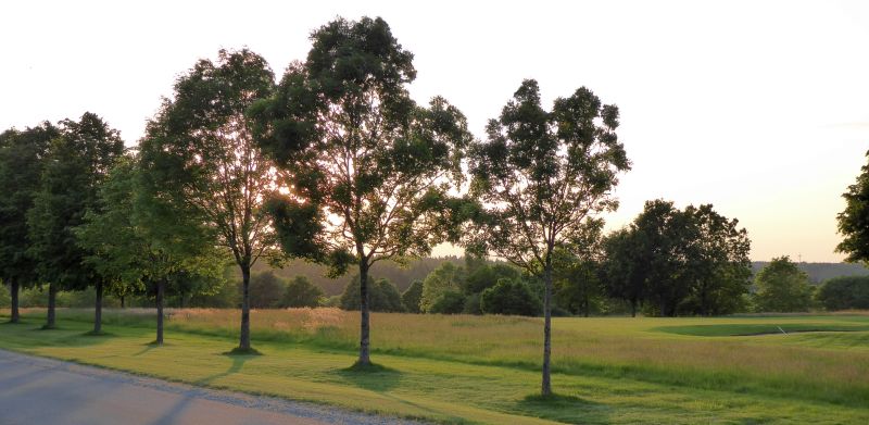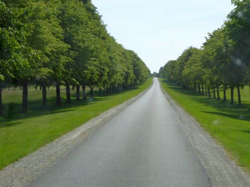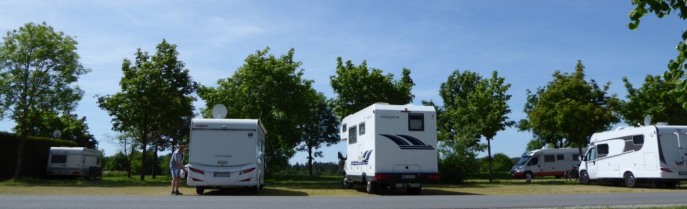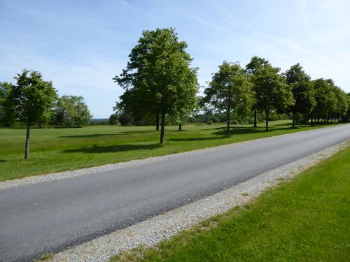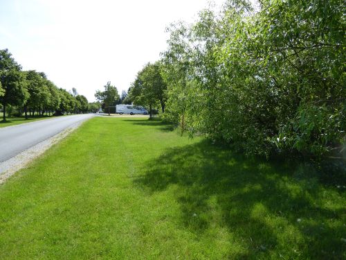 Zuerst kommt eine ewig lange Lindenallee durch den Golfplatz, und dann sieht man den Stellplatz.