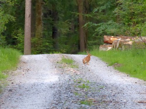 Hier läuft Carl, und kurz drauf begegnet uns ein Hase. Ich glaub, der hat noch nie Spaziergänger hier gesehen, denn wir sind weit ab von jeglicher menschlichen Behausung.