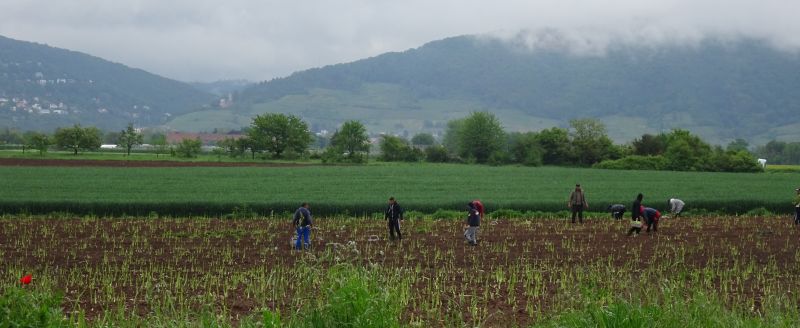 Es hat die ganze Nacht geregnet, und morgens sind die Spargelstecher schon am Werk.