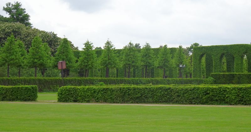 Auf der anderen Seite des Grabens können wir ab und zu einen Blick in den Park erhaschen, aber der Weg wird uns durch ein Drehkreuz versperrt, denn das ist nur für Inhaber von Jahreskarten.