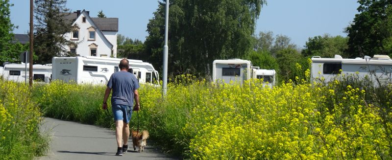 ein Womo draußen auf dem Parkplatz. Wir kennen uns aus Bad Soden, und das Hundi