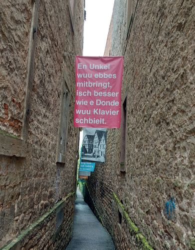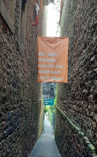Um in die Altstadt zu gelangen geht man durch eine schmale Lücke zwischen den Häusern, die für Kunst genutzt wird.