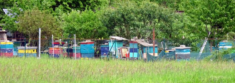 Und dann entdecken wir diese Bienenstöcke. Keine Ahnung, ob die hier gelagert oder in Betrieb sind.